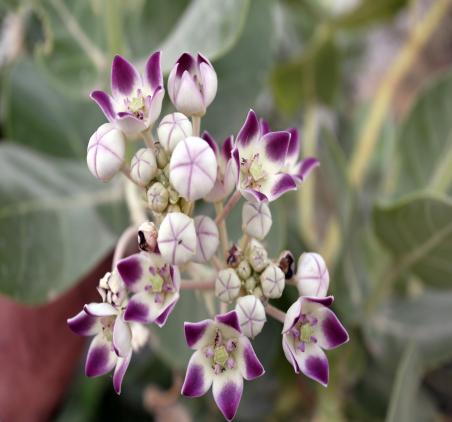 “A cluster of Calotropis flowers blooming in the desert landscape.”