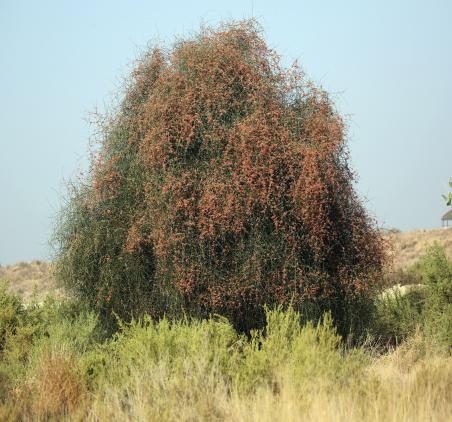 “A desert berry tree bursting with vibrant red berries.”