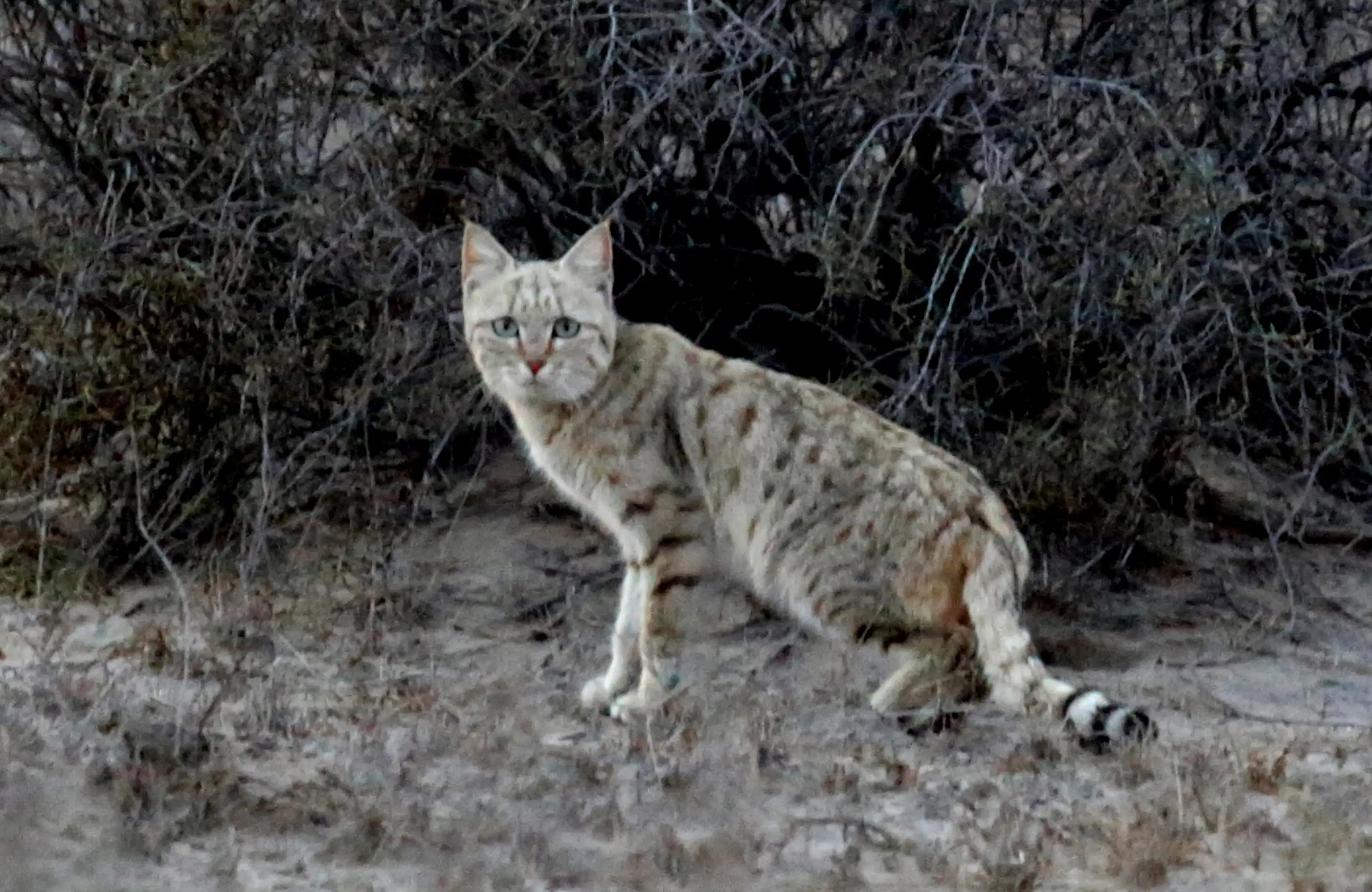 “The elusive Asiatic Wildcat pauses among desert shrubs.”